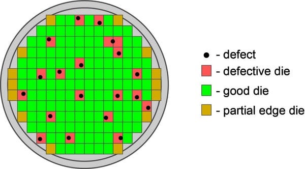 Empirically TSMC provides the highest product yield (a measure of % of a dies on a silicon wafer that is not discarded during the manufacturing process; In the picture below, the wafer is the circle, a die is a square).