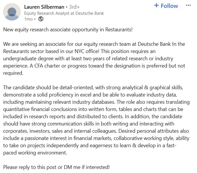 As you expand your sell-side research network, keep an eye on senior analysts' LinkedIn/Twitter accounts; they can post "I am hiring associates" statuses. This is your cue to send a tailored message and a stock pitch to initiate a conversation. Be particularly diligent between January and April, as associates tend to move after bonuses, creating job openings.
