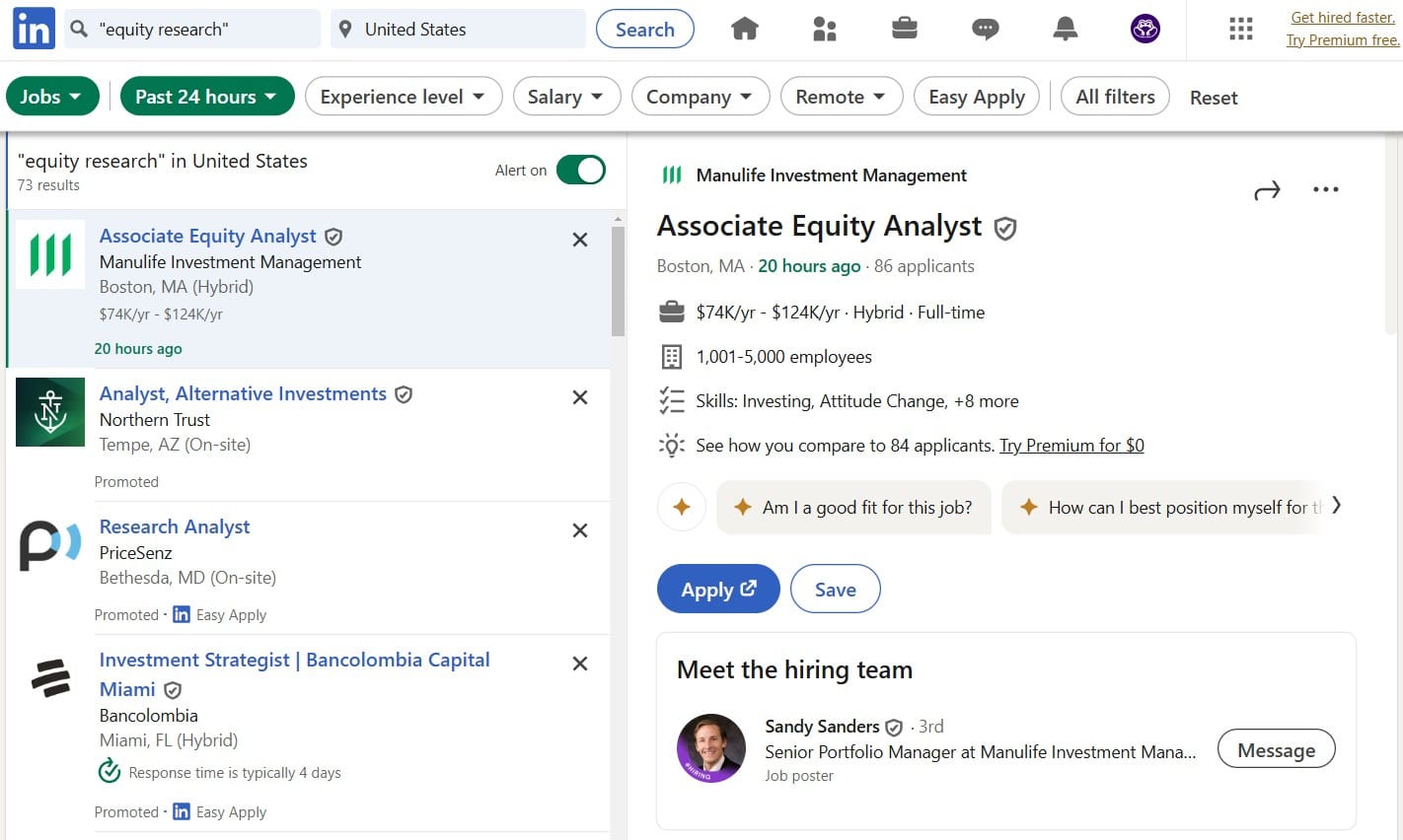 Create LinkedIn job alerts with keywords such as "Equity Research." You'll need to sift through them one by one to ensure it’s an active search.