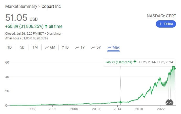 I believe Copart's moat is both strong and defensible, as the barriers to entry are tremendously high from both capital intensity and regulatory standpoints. Aside from valuation, which I won’t touch on because that would require understanding past stock movements, the other key point is its reinvestment runway—a critical criterion for continued compounding. For example, $100 of invested capital at a 30% ROIC means a $30 return. The goal is to reinvest that $30 at a 30% ROIC again (hence the compounding), which requires that the market opportunity is not fully penetrated and that competition isn’t driving down the ROIC over your investment horizon.