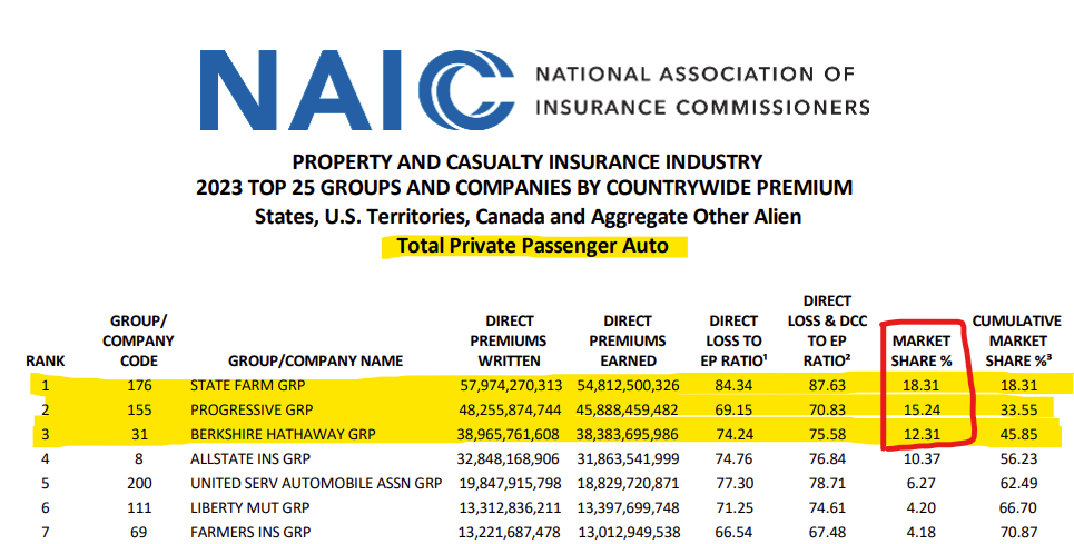 Copart sits between the sellers of cars, most of which are auto insurance companies, and the buyers (who the hell wants to buy totaled cars? As it turns out - many). The seller side is concentrated, with the top three players accounting for 45% of the auto premiums written.