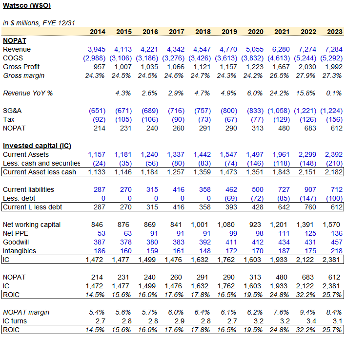 Watsco distributes air conditioning, heating, and refrigeration equipment and parts. Serving 125,000 contractors and dealers, Watsco operates in a market with a concentrated supplier base of 8 major players2, limiting its bargaining power. However, with 85-90% of industry unit sales coming from the replacement market driven by the aging of AC and furnace, and energy efficiency requirements, Watsco enjoys stable growth and has improved its ROIC to over 20% from a historical 15% ROIC player (if someone knows the name well, please educate me on what has driven the ROIC improvement in recent years.) Watson also has exclusive distribution agreements in certain territories with their top suppliers Carrier, Rheem, and Mitsubishi.