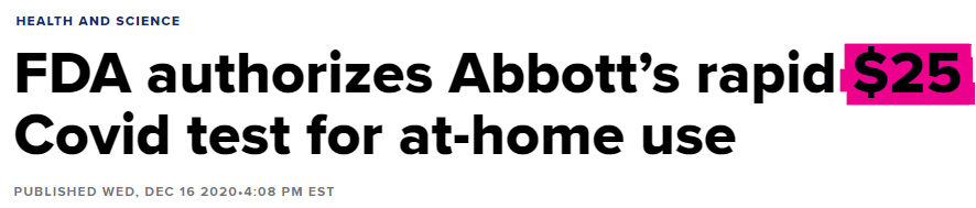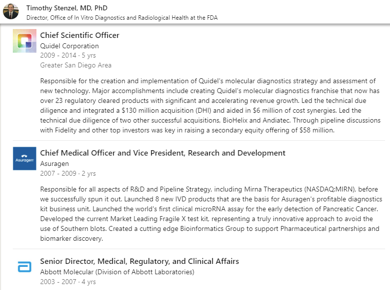 Interestingly, the person at the FDA overseeing the approval of rapid test vendors was Tim Stenzel. And guess where he used to work? Five years as Chief Scientific Officer at Quidel and four years as a Senior Director of Medical, Regulatory, and Clinical Affairs at Abbott.