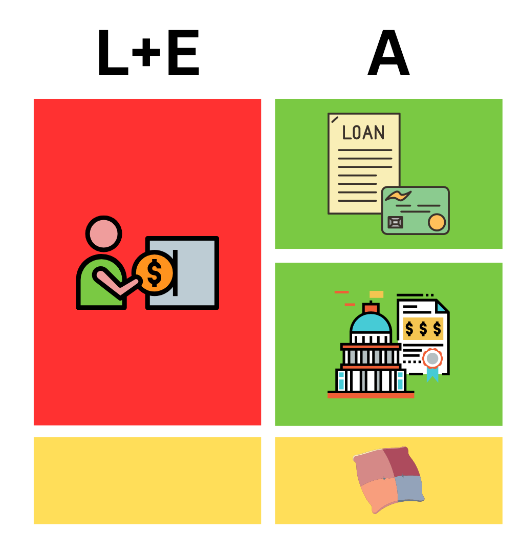 This is a super simple bank balance sheet: The deposits are the sources of funding for the bank. The assets are the uses of funding such as making a loan or buying securities. By regulation, banks are required to have an equity cushion to be prepared to absorb losses on loans and investments.