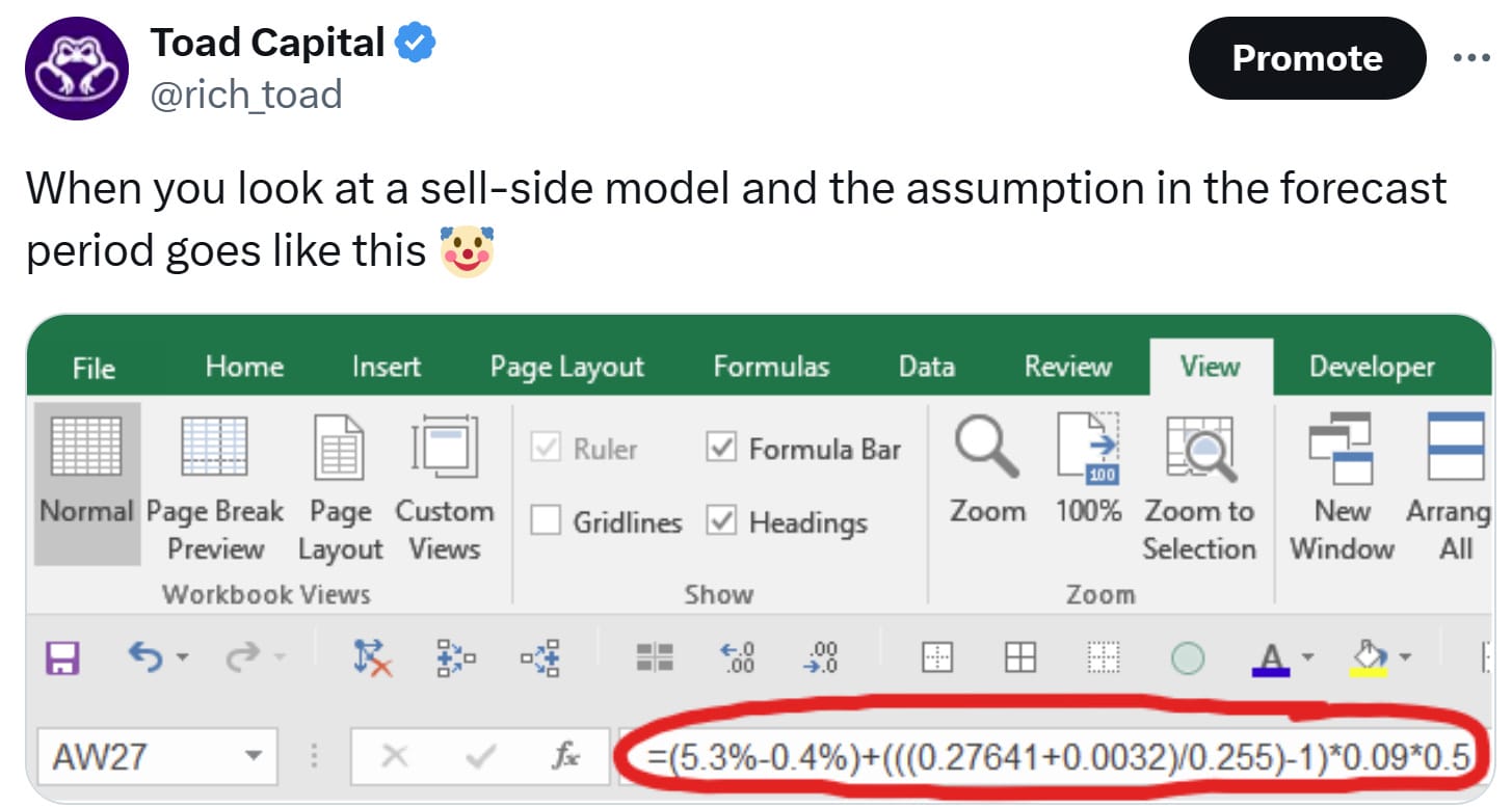 For buy-siders, this is a mixed bag. On one hand, you can rely on alternative providers or build their own models (which many do). On the other hand, if you work at a short-term focused shop, your portfolio manager will likely want you to understand how the sell-side is modeling the company. And that’s when the real nightmare begins—decoding an analyst’s convoluted logic in a model filled with unnecessarily complex formulas mixed with hard-coded assumptions.