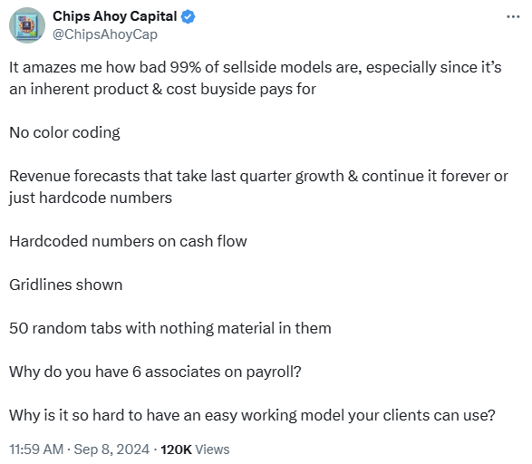 Recently, I came across an equity investor on Twitter venting frustrations about sell-side equity research models. I'm not here to defend the sell-side—I know that can be a losing battle—but I think there’s an opportunity for both sides to benefit more from each other. The key is understanding each other’s motives.