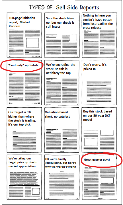 Smaller research firms tend to be more brazen about this, but the larger firms aren’t much better—they just do it less frequently and use more balanced wording.