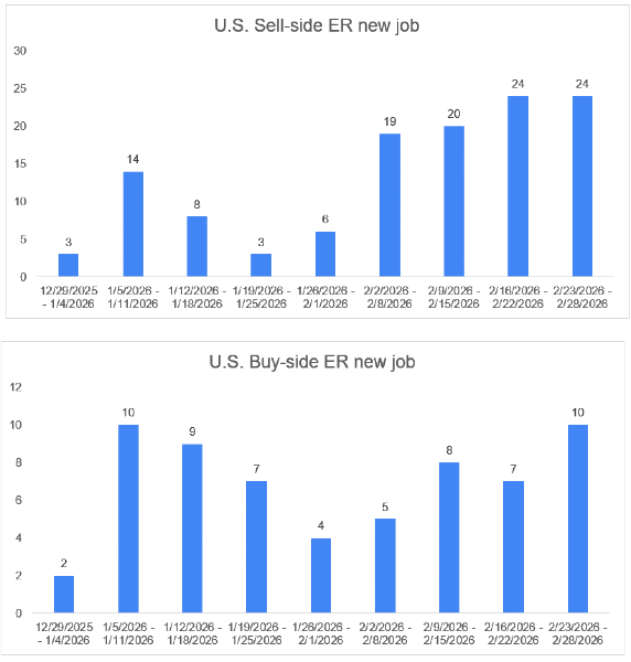 Below are the new buy-side and sell-side research jobs added by week (of course, the week of 2/23 is not over.) Bonus season is clearly underway — and hiring is picking up.